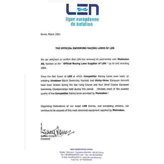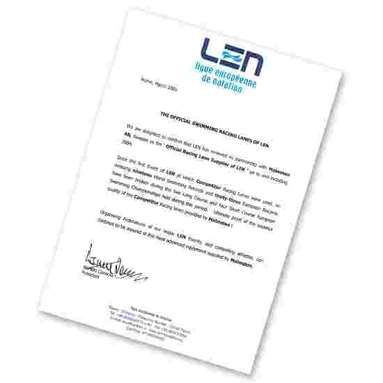 The turnbuckle is additionally covered with a cap and at the other end, there is a balancing spring to ensure that it sits well on the water. The competition line complies with DSV and FINA regulations, comes with red 15-metre markings and is suitable for use in chlorine and salt-water pools.
